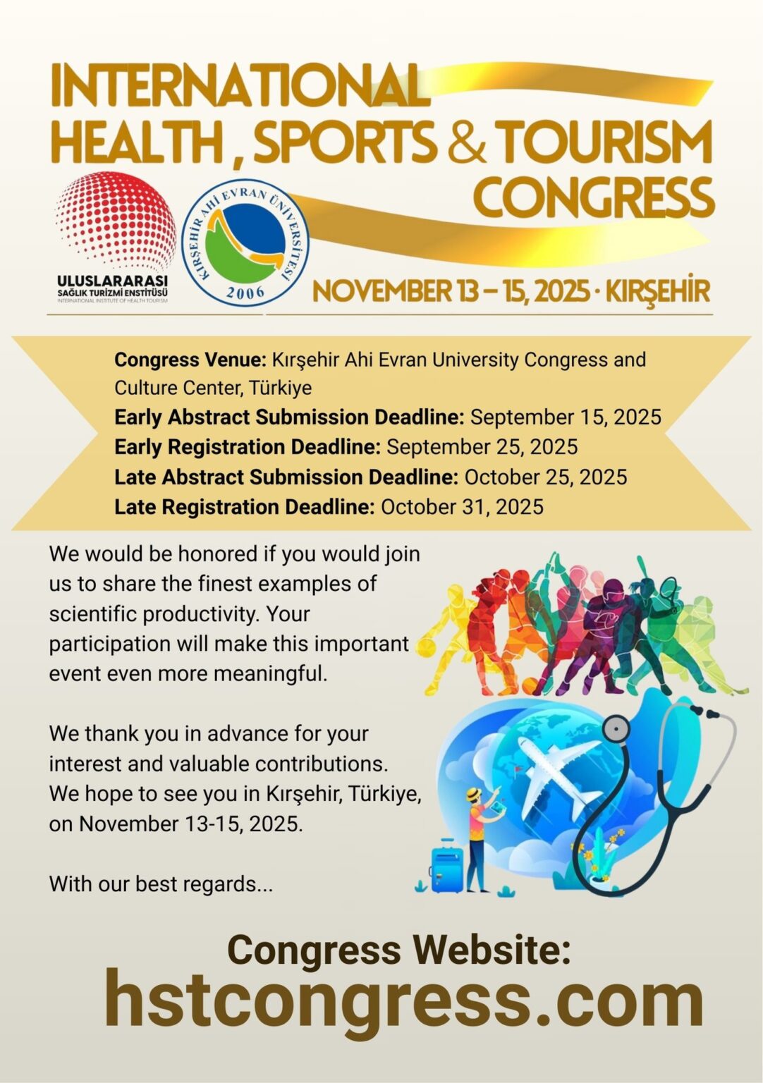 Uluslararası Sağlık, Spor ve Turizm Kongresi’ne katılımınız için sizi içtenlikle davet ediyoruz. Kongremiz, 13-15 Kasım 2025 tarihleri arasında düzenlenecek olup, sağlık, spor ve turizm alanlarındaki güncel gelişmeleri, yenilikçi yaklaşımları ve multidisipliner çalışmaları ele almak için eşsiz bir platform sunmaktadır.